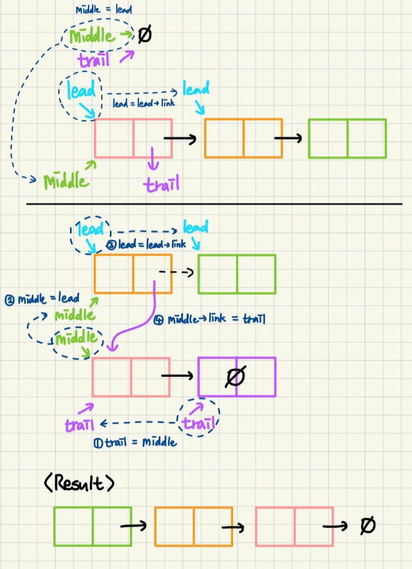 // lead를 list의 끝으로 향하도록 방향 바꾸기. 역순 만들기.
