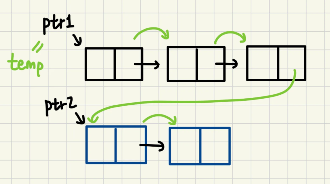 temp->link = ptr2; // ptr1 끝까지 저장 후 ptr2 연결