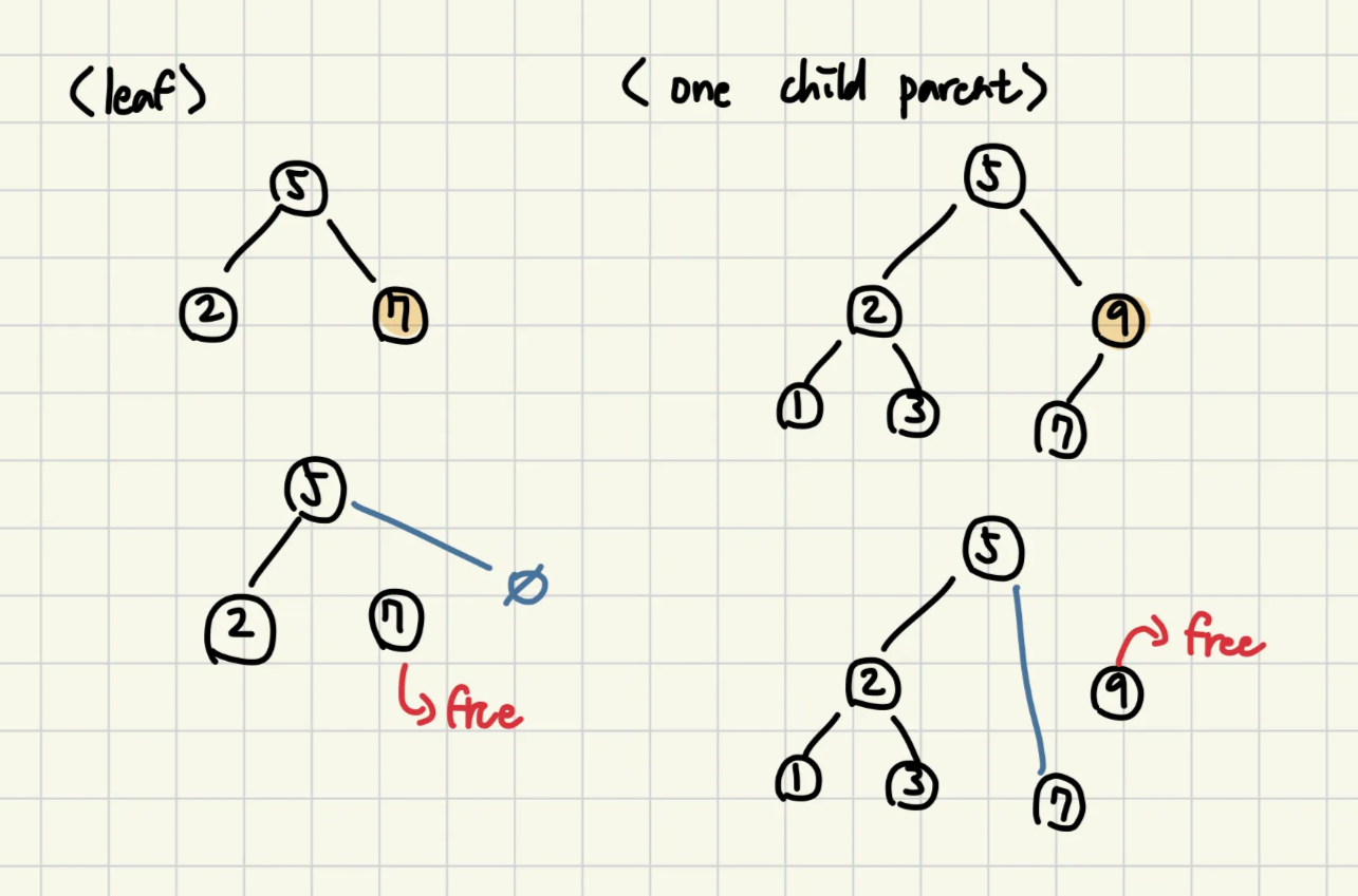 - parent의 leaf 가리키는 쪽 NULL 로 설정 후 free