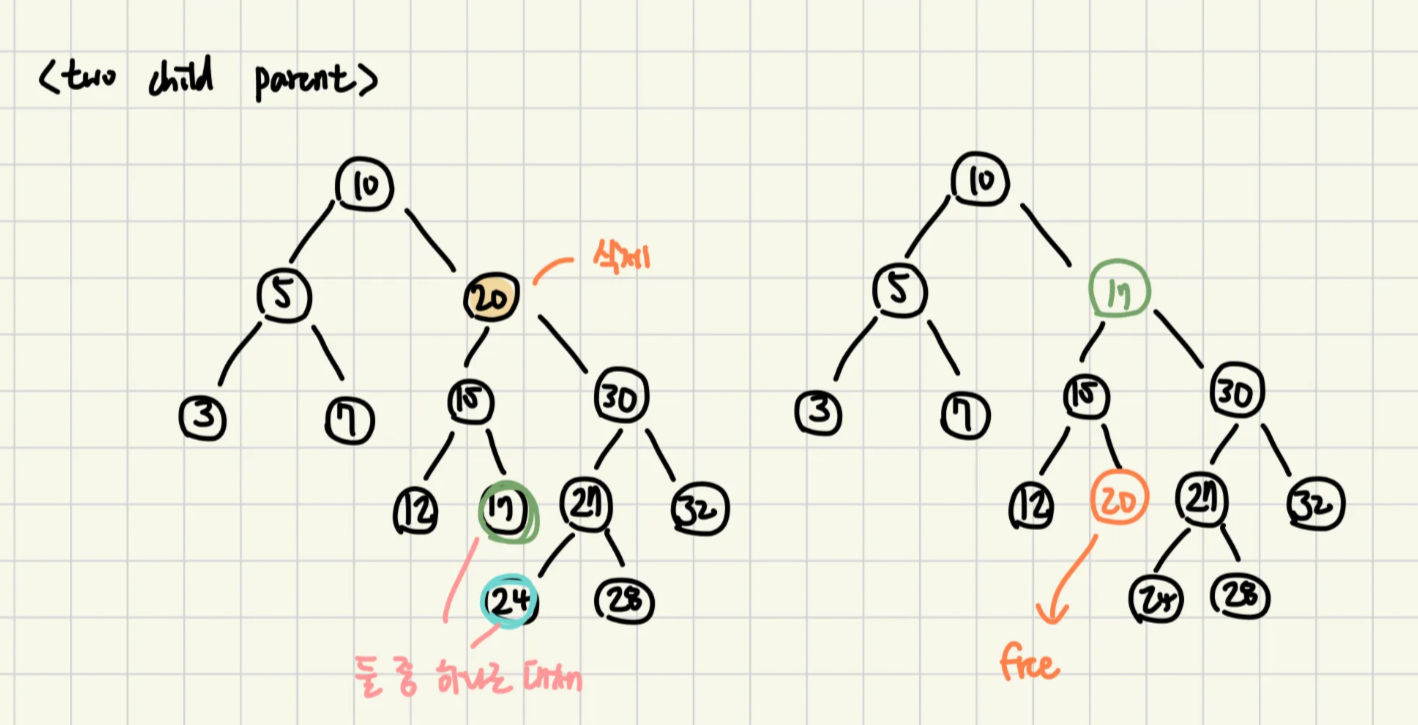 - 그 원소를 왼쪽 서브 트리에서 가장 큰 원소 or 오른쪽 서브 트리에서 가장 작은 원소로 대체.