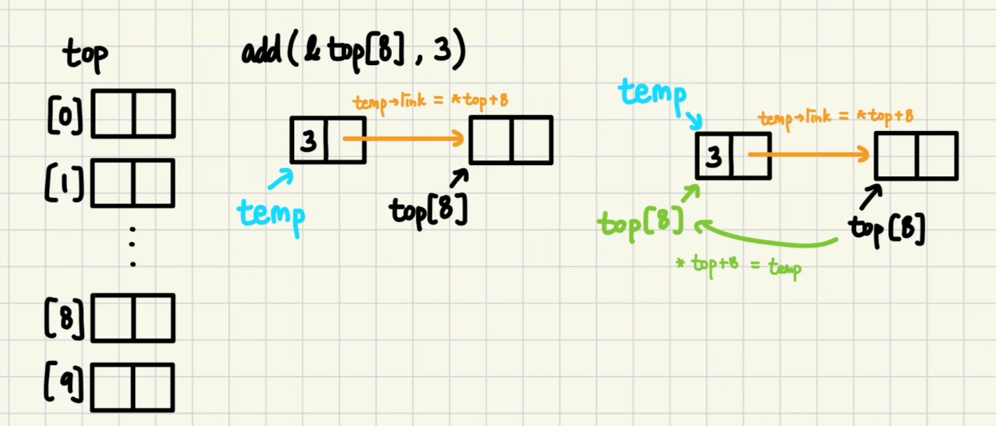 - 호출 : add(&top[i], item) → i 번째 stack의 top에 item 추가