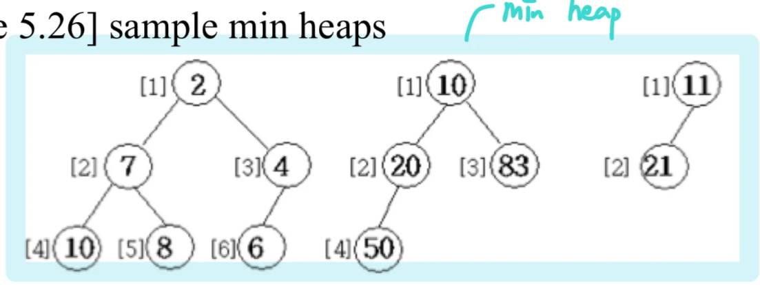 - Min tree : parent의 값이 child의 값보다 크지 않음(작거나 같음) & complete binary tree(오른쪽부터 꽉 차 있음)