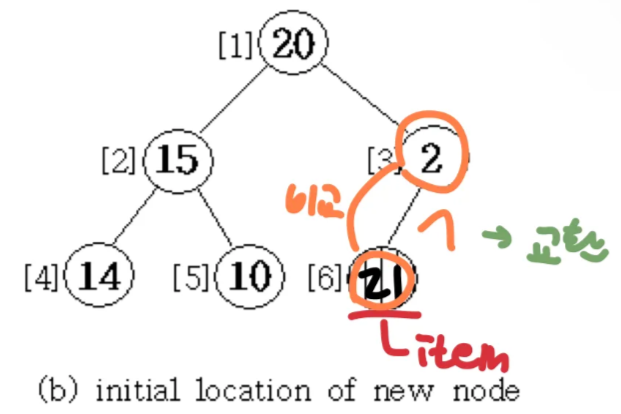 while ((i != 1) && (item.key > heap[i/2].key)) { // root 가 아니고 parent 보다 크면