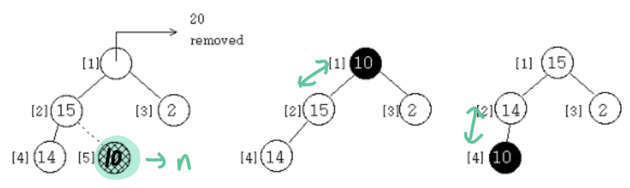 // 마지막 node 이용해 heap 다시 균형 잡기
