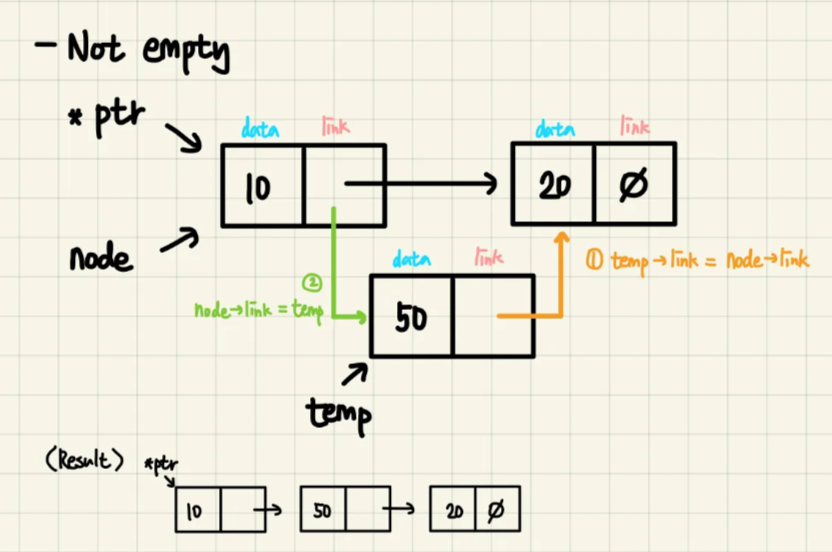 node->link = temp; // ② 기존 연결 바꾸기