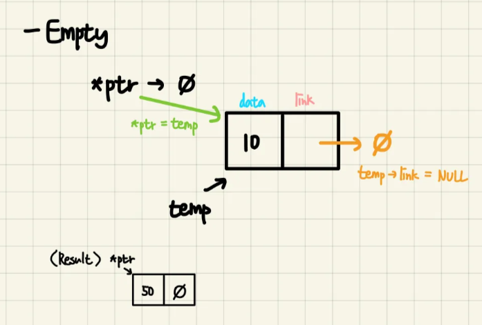 temp->link = NULL; // temp가 첫 node