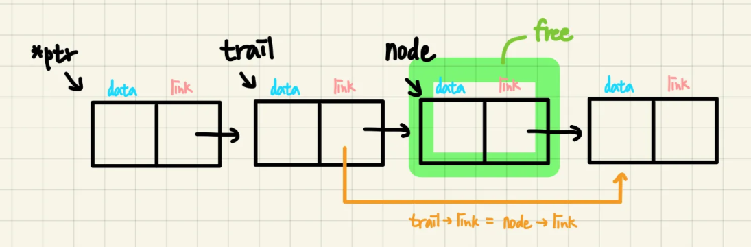 trail->link = node->link; // 삭제 node의 다음을 연결