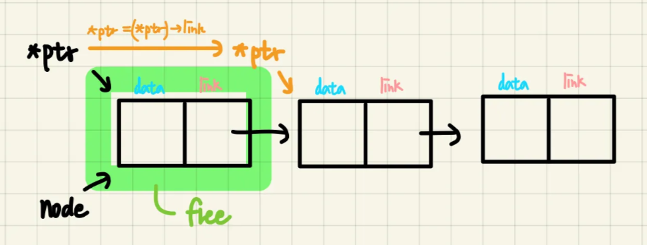 *ptr = (*ptr)->link; // 삭제 node의 다음 node를 list의 시작점으로